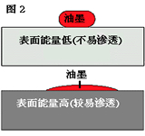 如果油墨的張力比物件大,油墨就不能貼服于物件表面。要改善此情況,物件需預先經其他方法處理。所以要油墨有效地黏貼于物件上,油墨的張力必需比物件的表面能量低(圖2)。當物件表面有油脂,塵埃或其他添加物等,均需預先清潔以確保最佳的上色效果。